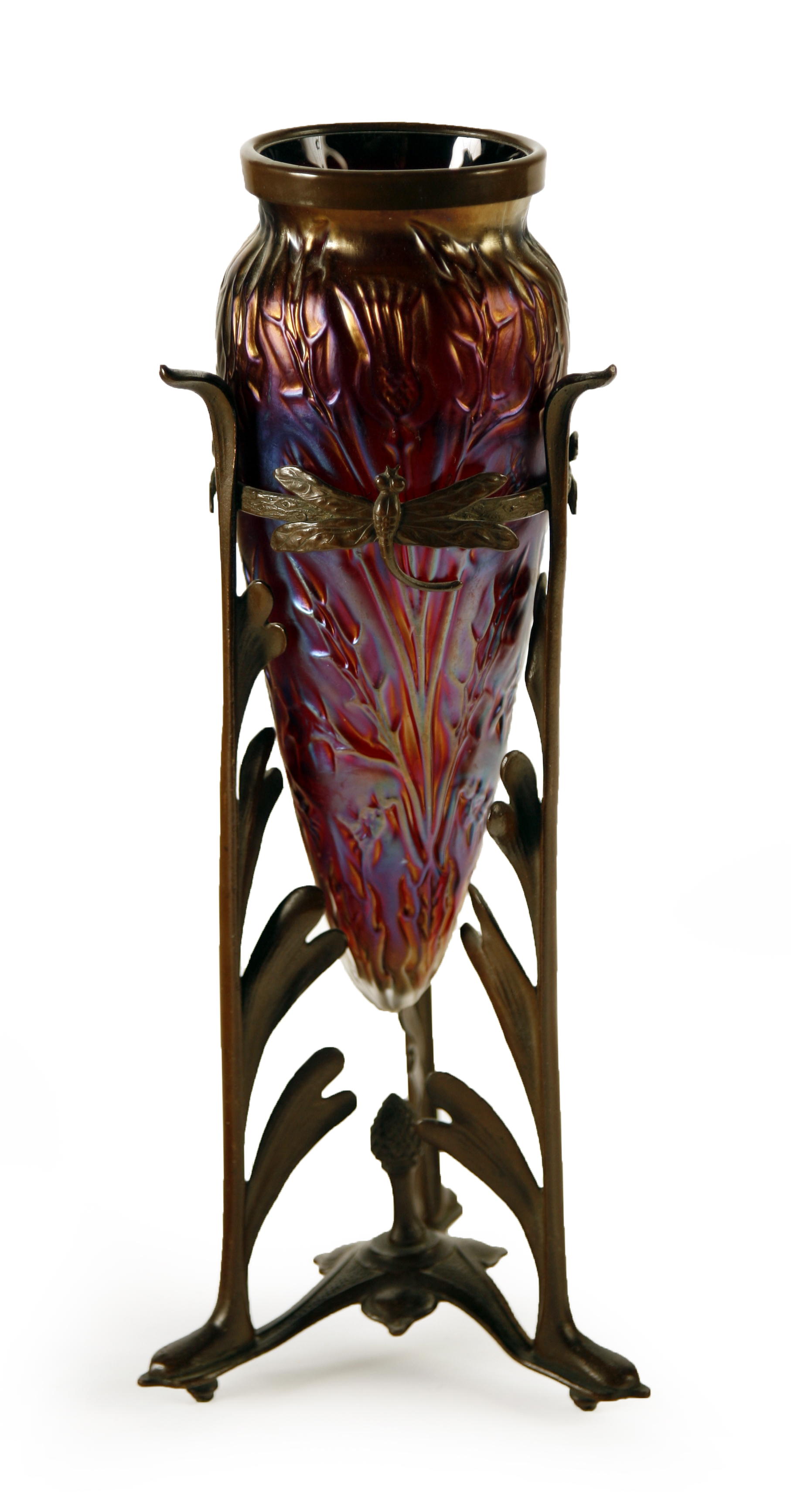 moulded with thistles, set in a bronzed tripod base decorated with dragonflies