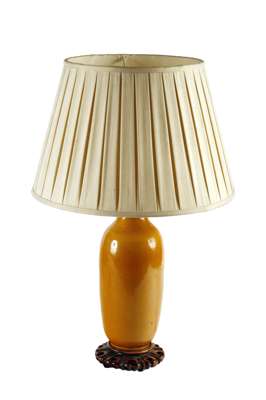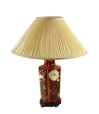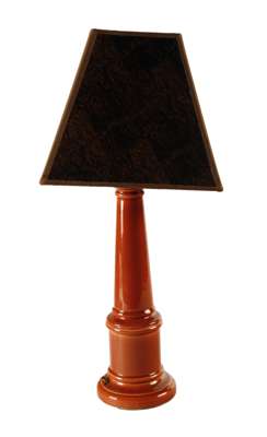 all with shades, comprising: a modern Chinese rust ground example; a tapered ceramic rust ground lamp base; an obelisk form table lamp; and a Chinese ochre glazed ceramic base (4)