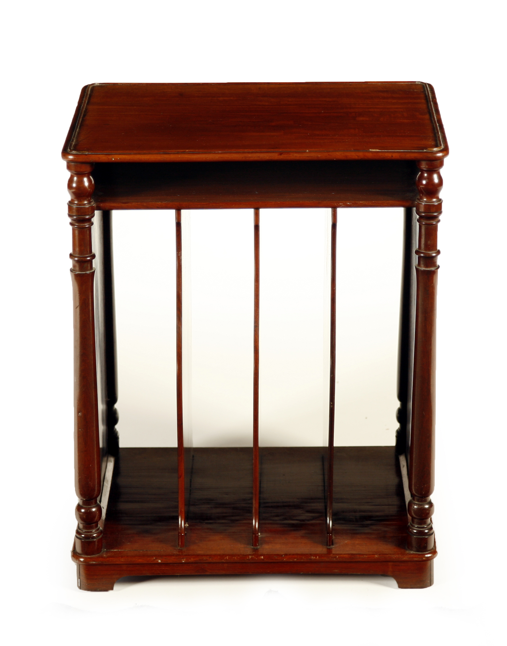 with an open platform above four open shelves/dividers, flanked by two pairs of turned columns