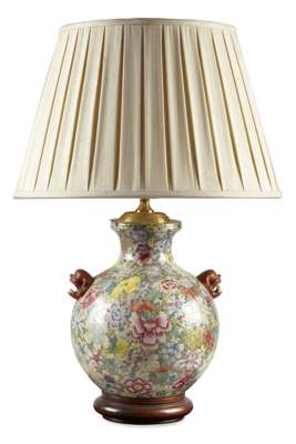 the ovoid body with grotesque rouge-de-fer and gilt mask handles, with all over gilt and polychrome decoration, converted to a lamp