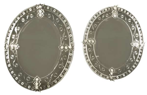 the oval bevelled mirror plate within an engraved mirrored frame (2)