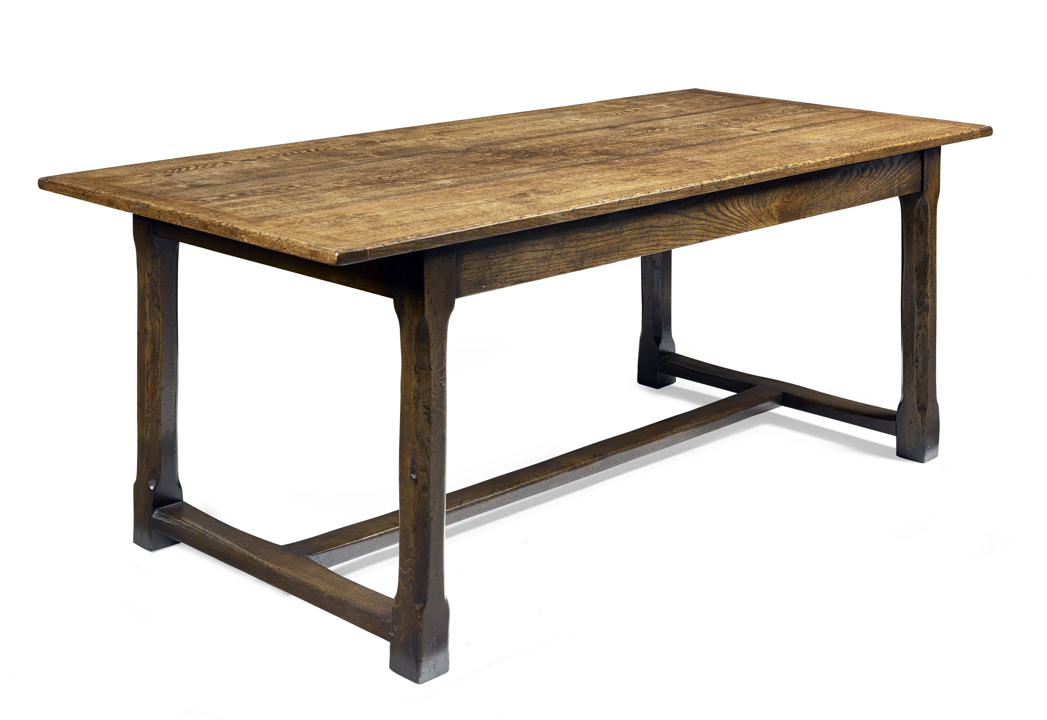 the rectangular plank top with cleated ends raised on chamfered straight legs joined by an H-stretcher