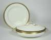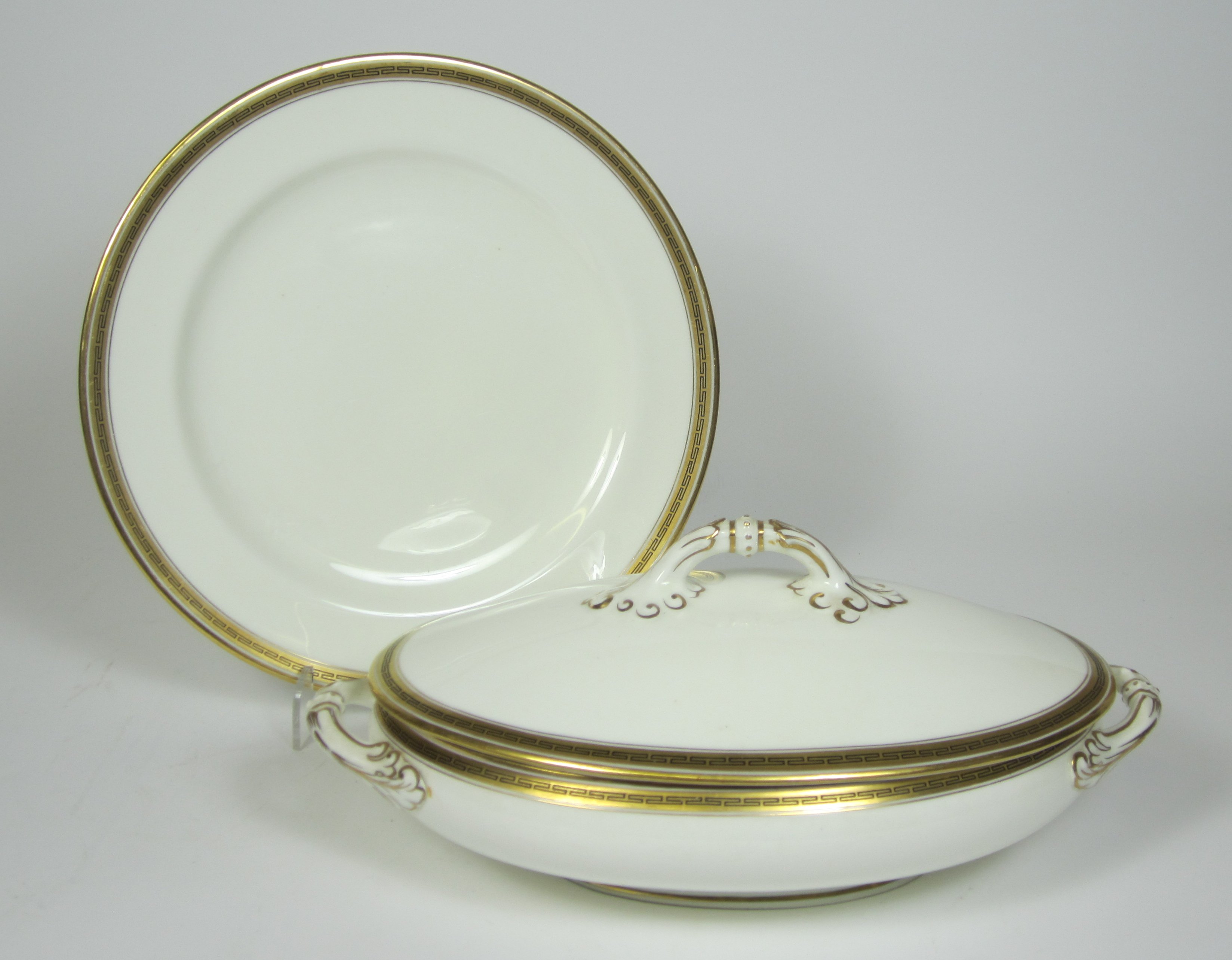 each piece decorated with a greek key border and gilt highlights, with maker's marks, comprising of: five graduated ashets; a large tureen and cover; two oval tureens and covers; a smaller oval tureen, cover and stand; a further stand; 17 dinner plates; 14 soup plates; eight luncheon plates; 18 dessert plates; six side plates and 12 crescent shaped dishes; together with a QUANTITY OF ASSOCIATED DINNER WARES, variously marked (qty)
