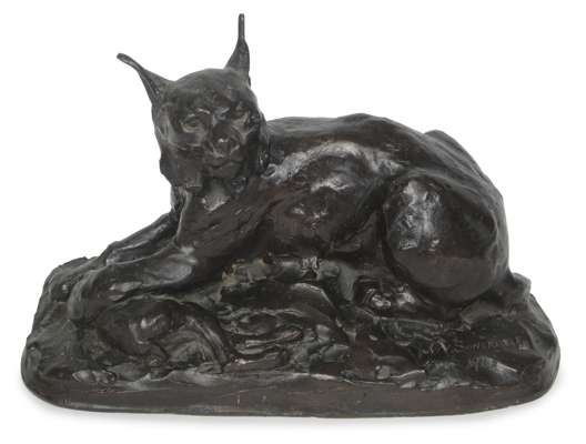 dark brown patina, modelled as a recumbent lynx with prey on a naturalistic ground, indistinctly signed '*. W. Somerville, 1913'