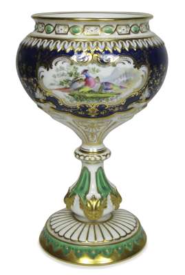 the ovoid body depicting panel with exotic birds on a blue and gilt ground, above the knopped stem and circular foot, all decorated with green and gilt highlights, maker's marks