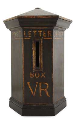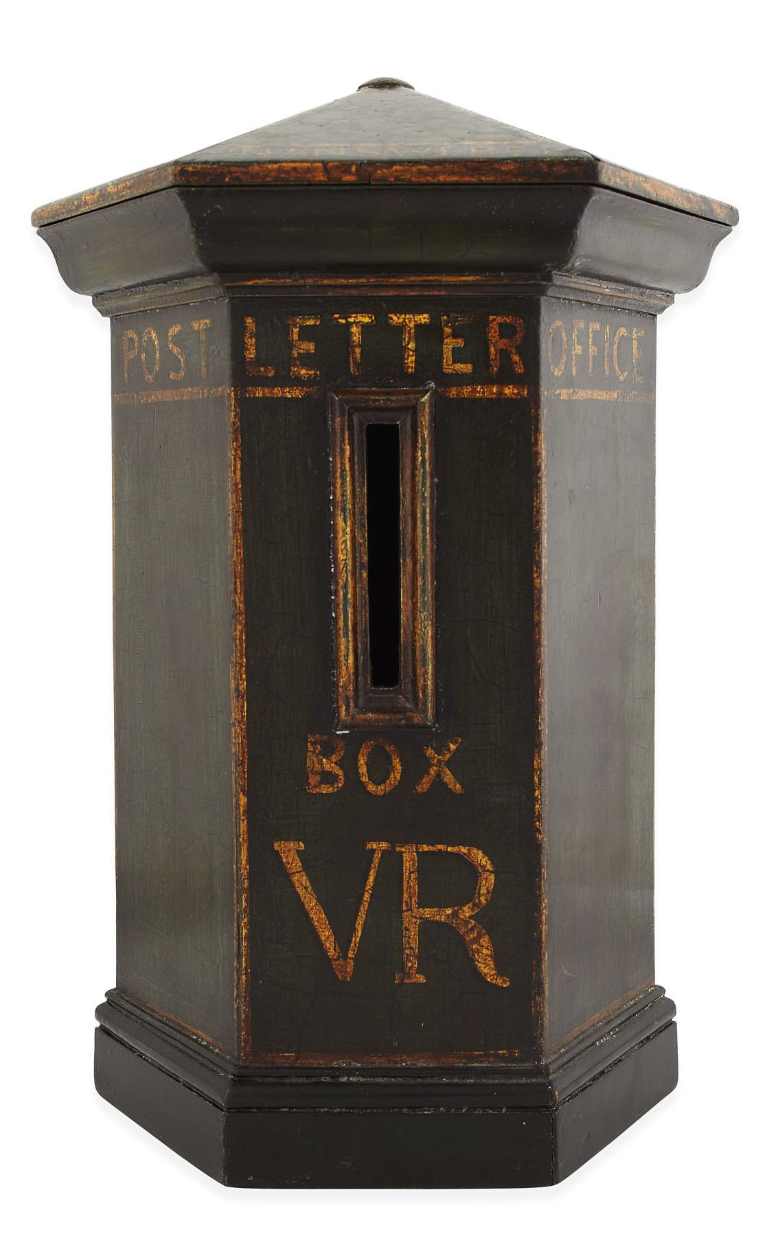inscribed 'POST OFFICE LETTER BOX VR,' the detachable cover inscribed 'ANSWERED' and 'UNANSWERED, raised on moulded plinth bases, the painted surface refreshed (2)