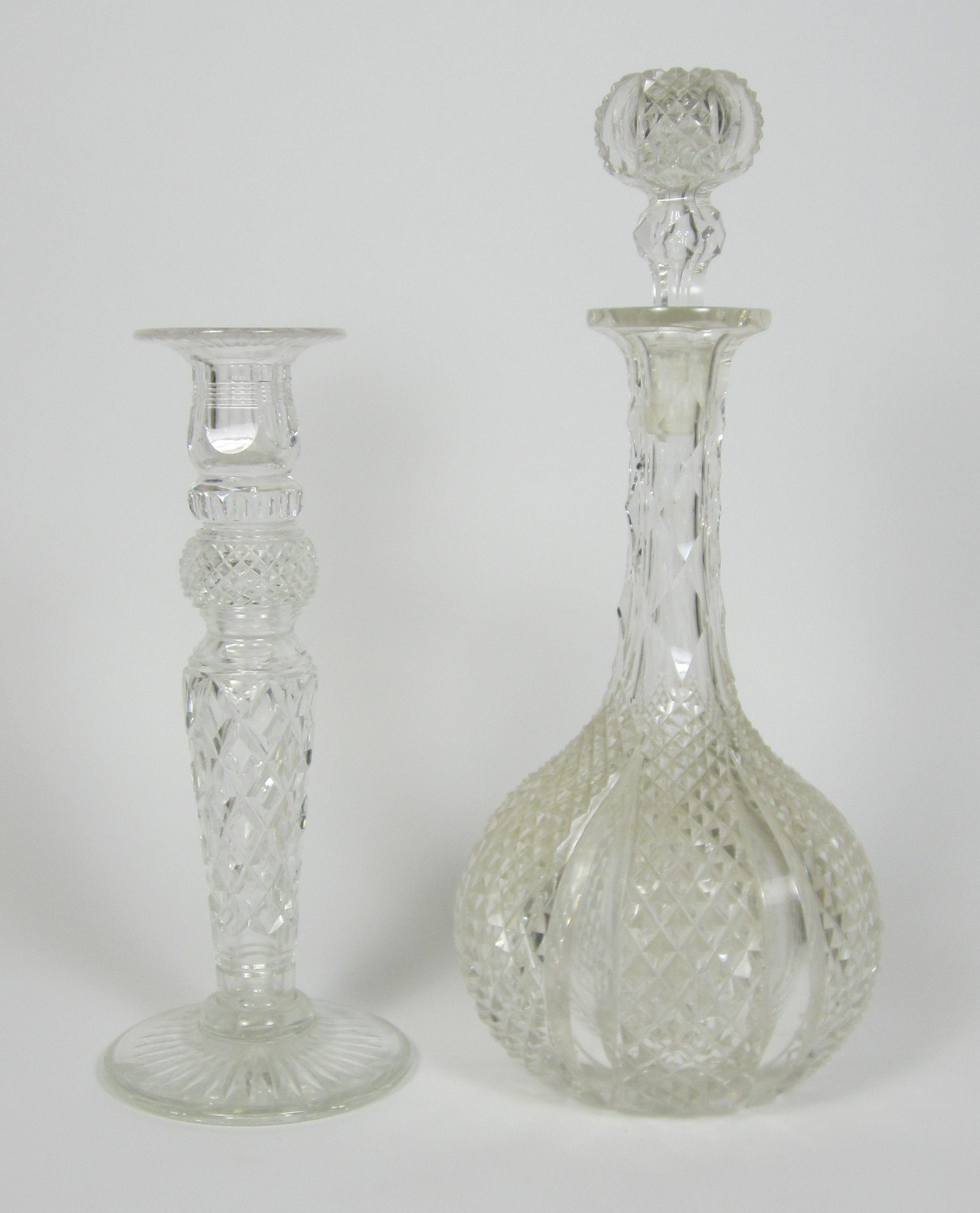 each of bottle shape, with strawberry cut decoration, 33.5cm high; together with a SET OF FOUR CUT GLASSES CANDLE STICKS, each with a decorative strawberry cut knopped stem, with a removable sconce, 25cm high (7)