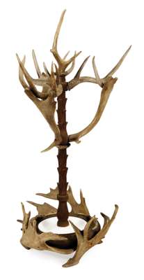 modelled with sets of curved antlers above the carved wood column, and raised by a circular stand fitted with a ceramic tray