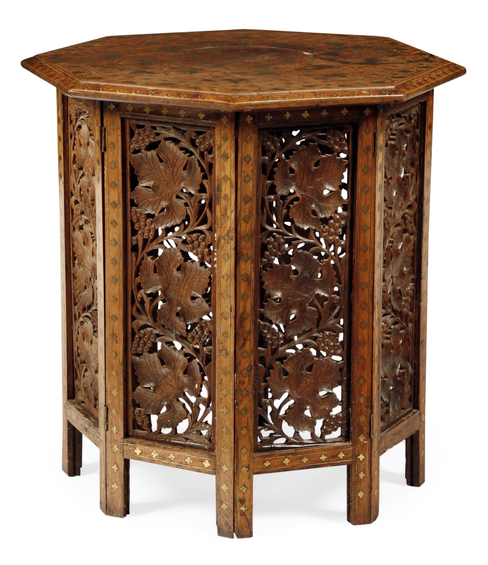 the top surface inlaid with scrolling brass leaves, above the carved sides of similar design