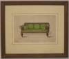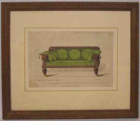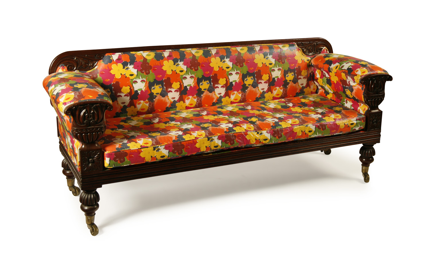 upholstered in Andy Warhol inspired fabric with repeating Liza Minnelli print, the carved top rail above a cushioned back and arms and a loose cushioned seat, raised on turned fluted legs and brass caps and casters, 214cm high, 90cm high, 58cm deep; together with a COLOURED PLATE, depicting a similar sofa design, signed 'J. Taylor Del, 16 Bedford Court Gardens', framed and glazed, 13.5 x 20.5cm (2)