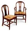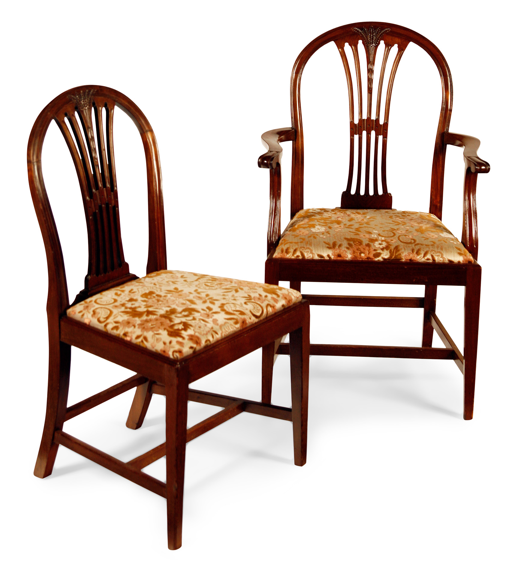 the arched back and pierced vertical splat above a drop in pad seat, raised on square tapering legs, united by stretchers