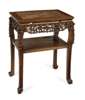 the moulded rectangular top above a foliate carved frieze, over an under tier, raised on square legs and ball and claw feet