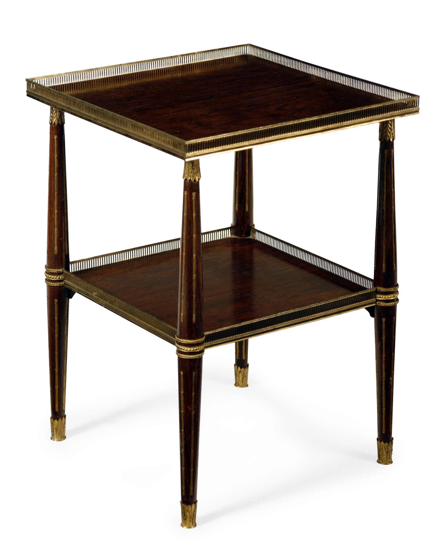 the square galleried top above an under tier, raised on turned legs and brass caps