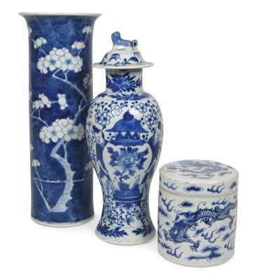 comprising of: a sleeve vase, decorated with the prunus and cracked ice pattern, four character mark, 30cm high; a baluster vase and cover, depicting figures holding a large vase, 28cm high; and a jar and cover, decorated with dragons, 11cm high (3)