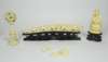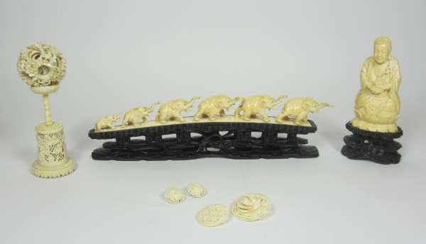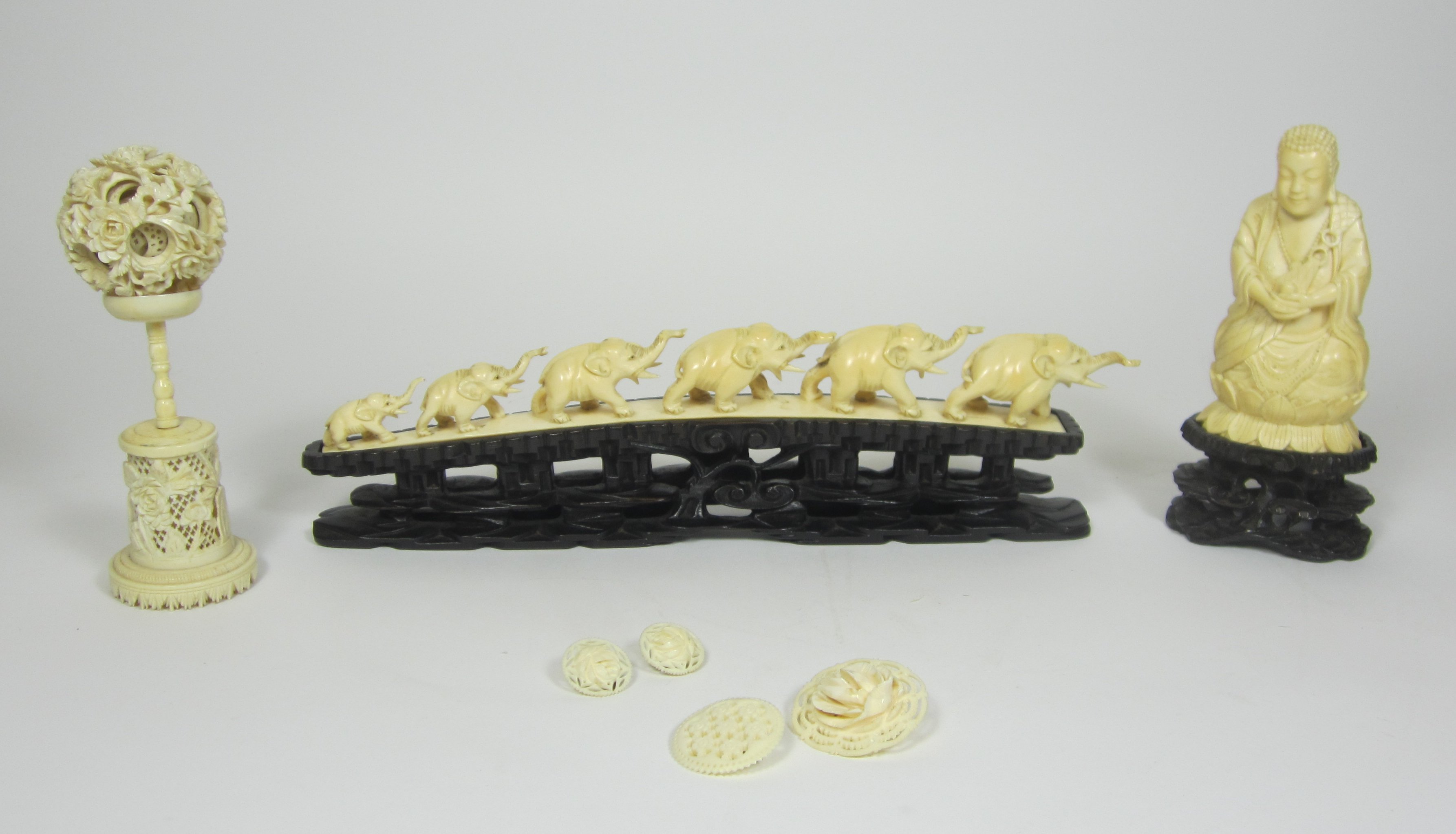 to include: a tusk carved with a graduated row of elephants, on a hardwood stand, 31.5cm long; a figure of a long eared Buddha, on a hardwood stand, 16.5cm high overall; a puzzle ball and stand (A/F), 16cm high; a carved broach and pair of matching earrings; and a further broach (qty)