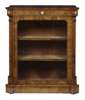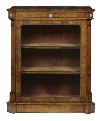 the rectangular top with outset square corners over an inlaid frieze mounted with blue jasperware medallions, above a glazed door opening to a plush lined shelved interior, on a conforming plinth base