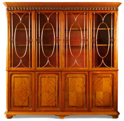the moulded cornice above astragal glazed doors enclosing adjustable shelves, over inlaid doors, raised on bracket feet