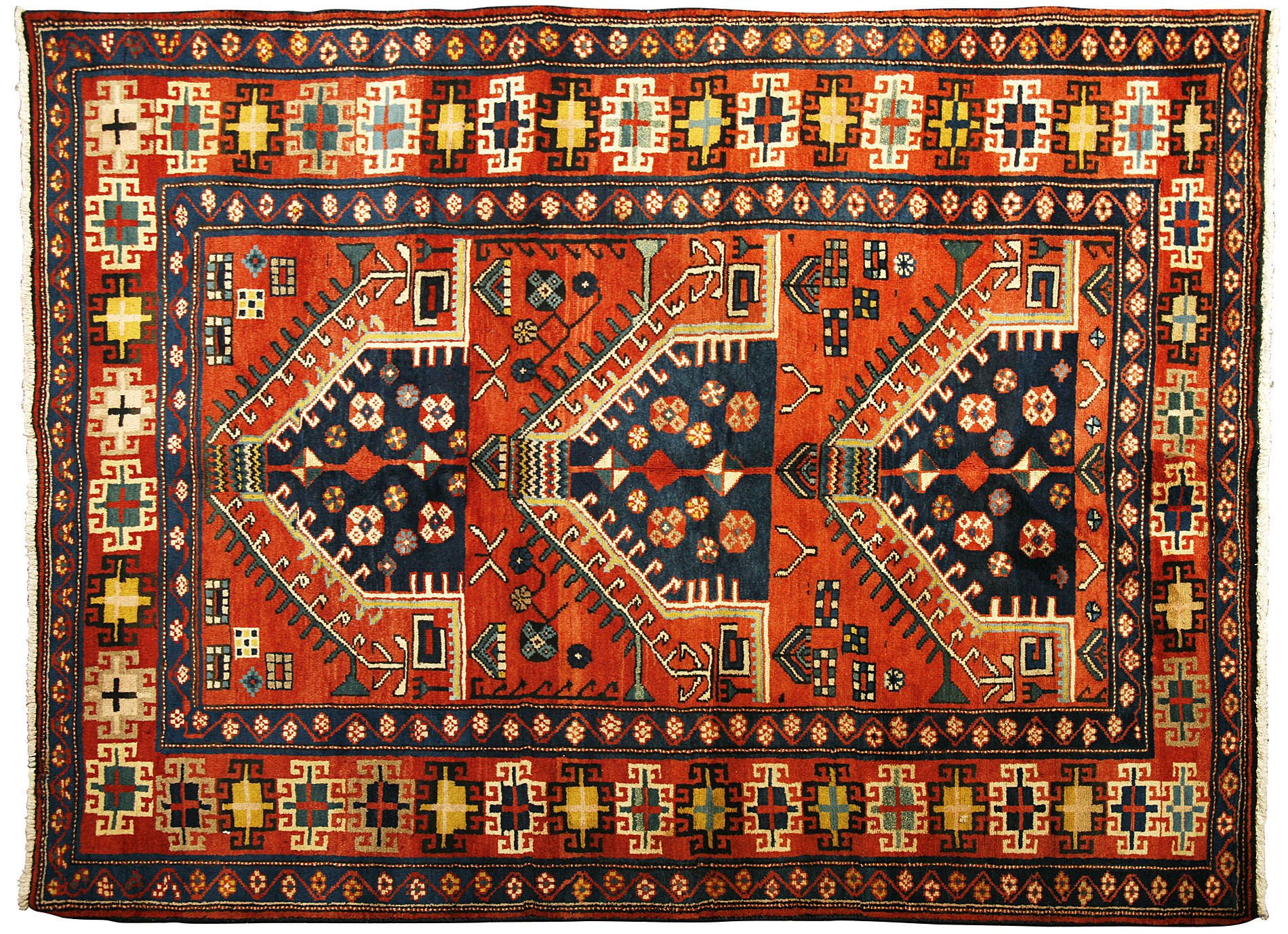 the red field with three shaped indigo medallions, within red hooked square border between bands