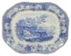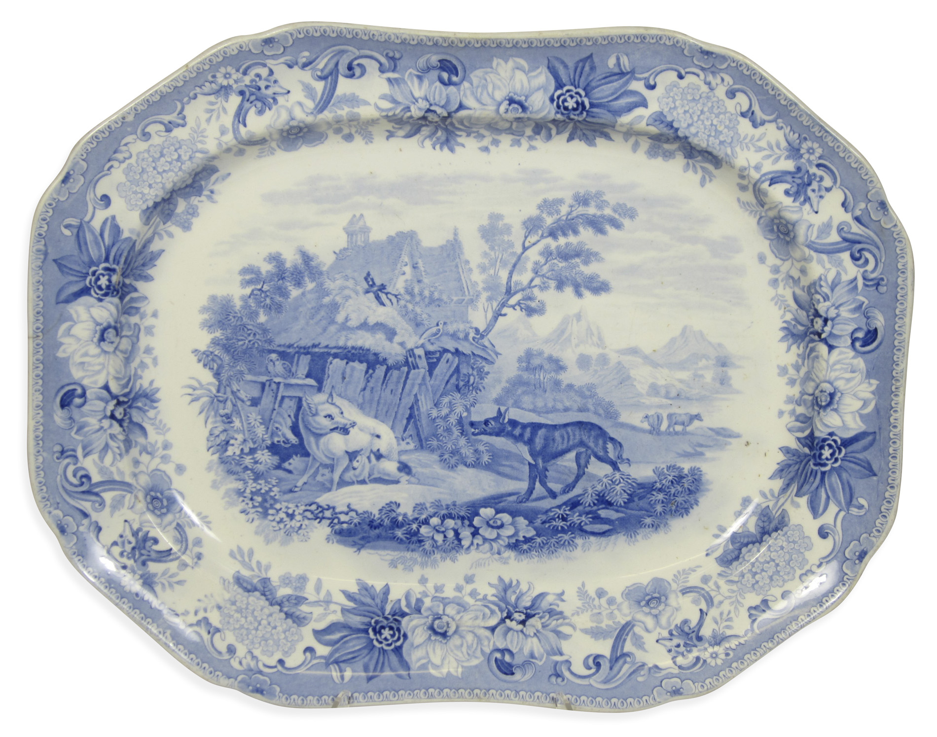 comprising of: a Spode 'The Sow and the Wolf' pattern example, based on 'Aesop's Fables', stamped and impressed marks to the underside, 42.5cm wide; and three further examples featuring horses before ruins, one marked 'Malmsbury Abbey, Wiltshire' to the underside (4)