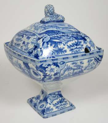 with a demi lune shaped platform, 16cm high approx. (A/F); together with a GROUP OF BLUE AND WHITE TUREENS AND COVERS, some with matching patterns, one marked 'Rogers', including a footed comport and a further cover (tureen lacking) (qty)