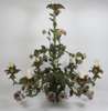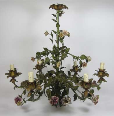 the ornate frame decorated with scrolling branches and porcelain flower heads, with six outscrolling arms with gilded sconces