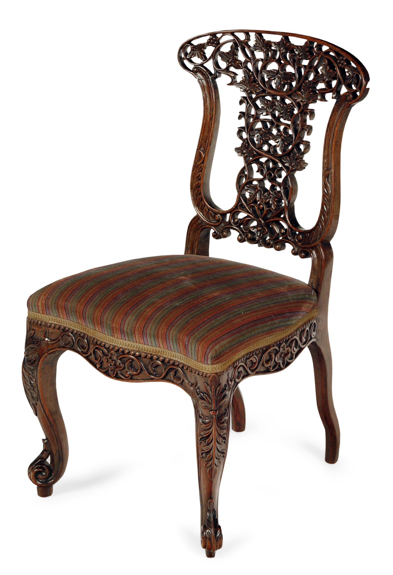 the ornate pierced back carved with scrolling foliage above the upholstered seat, supported by a carved apron and cabriole legs