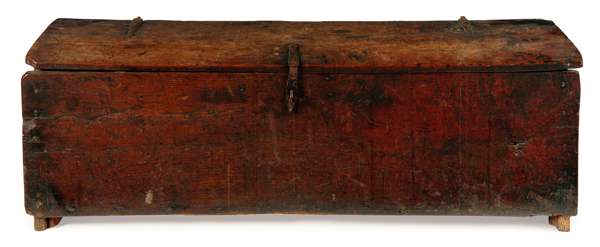 the hinged rectangular top with an iron hasp above a plain front, raised on stile feet