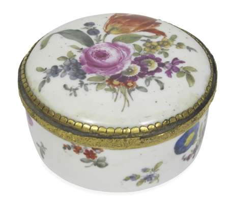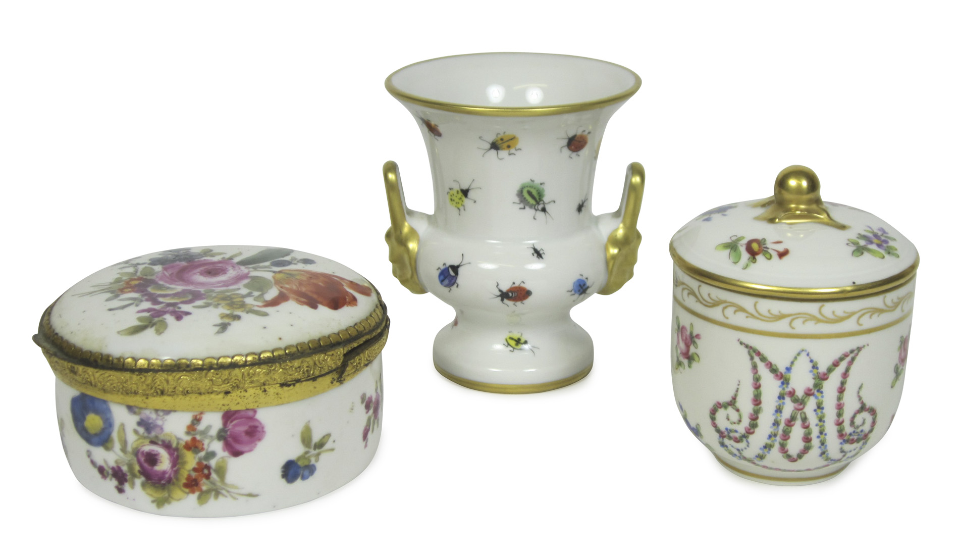 comprising of: four urns decorated with insects, with gilt highlights, maker's marks, 8.5cm high; two pairs of jars and covers, with flower sprigs and monograms, maker's marks, tallest 8.5cm high; a hand decorated box and cover with a gilt metal mount, 9cm diam.; and two canted boxes and covers, one decorated with a female in a landscape, the other with flower sprays, variously marked, 17cm wide (11)