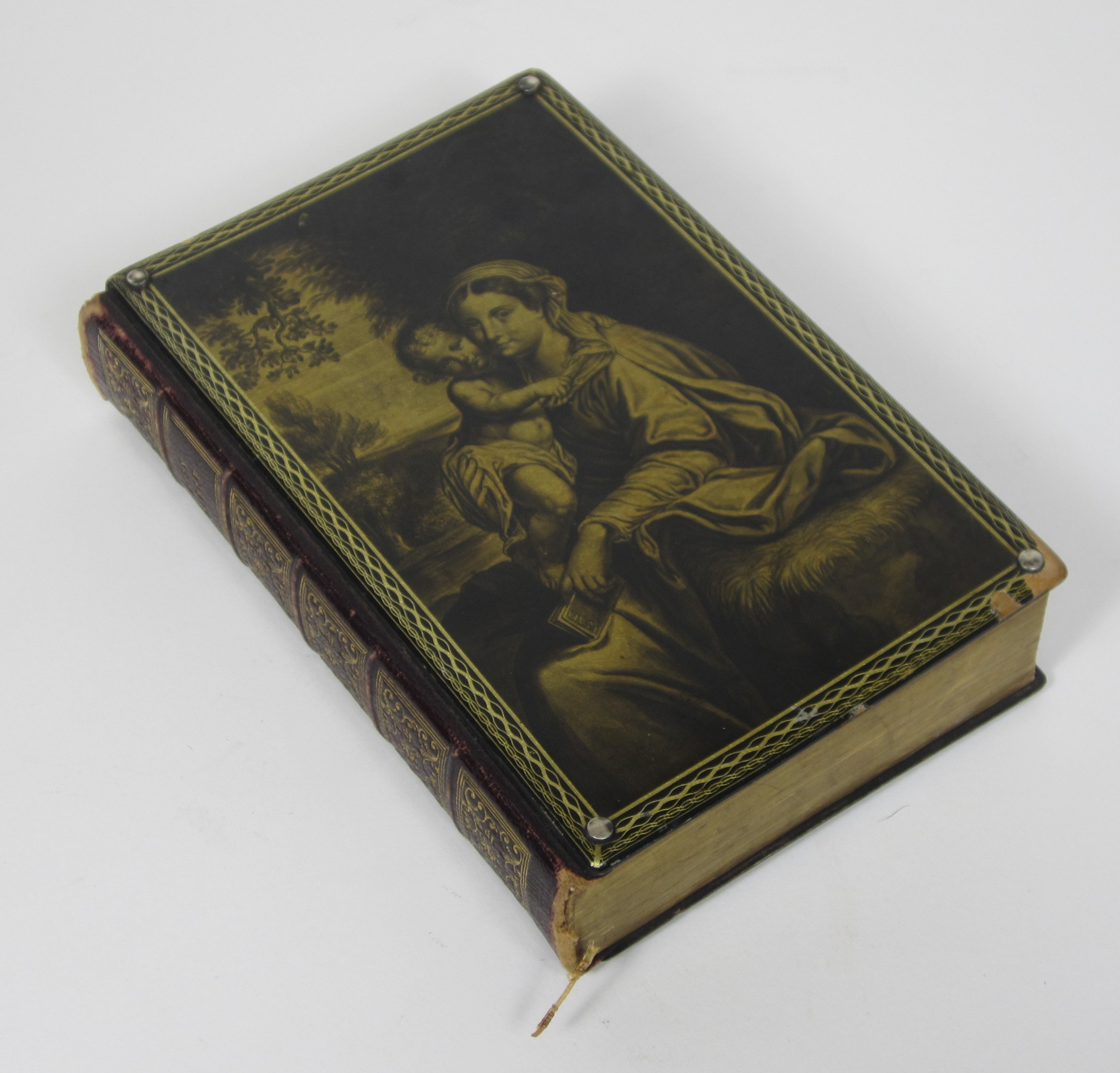 the front cover depicting a mother and child, the reverse with tartan printed covering, 'The English Version of the Polygott Bible; Containing Old and New Testaments', Samuel Bagster, London
