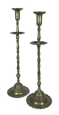 NEAR PAIR OF TALL BRASS CANDLESTICKS