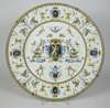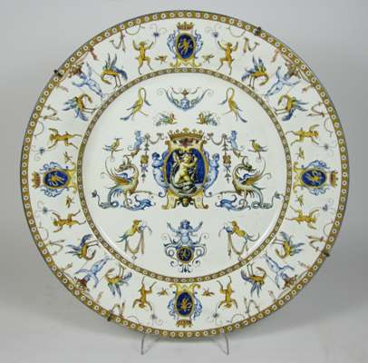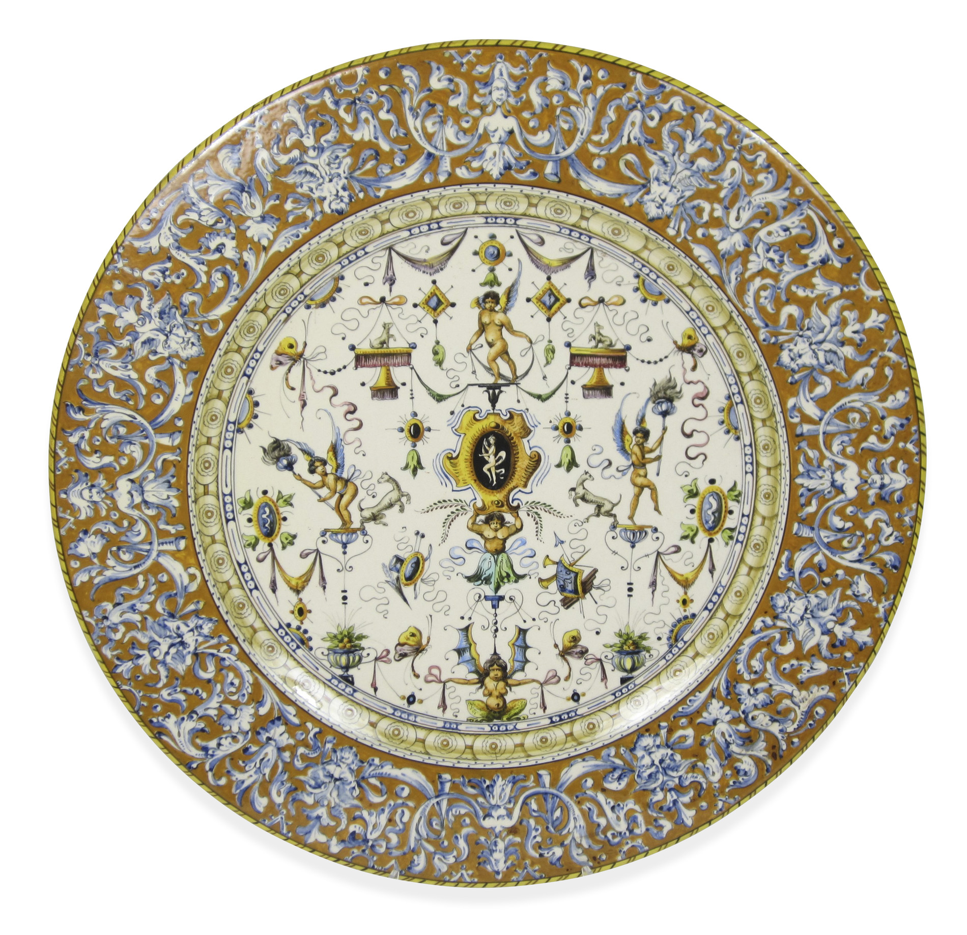 the first, decorated with numerous cherub, animal and floral motifs, within an ornate ochre border, painted marks and retailer's label, 46cm diam.; the second, with a central crest surrounded by mythical creatures and grotteschi, stamped '10' and with a paper label , 44.5cm diam. (2)