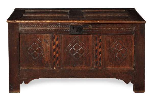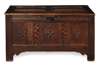 the paneled hinged lid enclosing a void interior, above a carved and inlaid panel front, raised on block feet