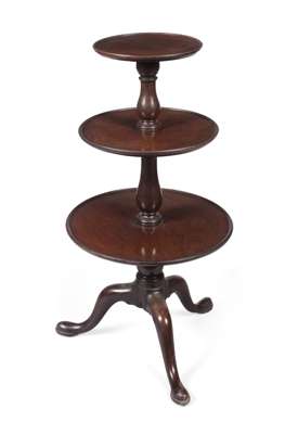 with three graduated dished circular tiers on a central baluster turned support and ending on cabriole legs with raised pad feet