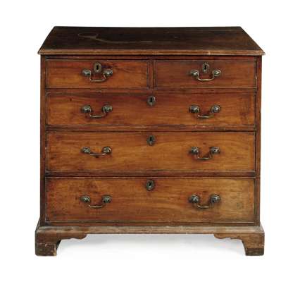 the moulded rectangular top above two short and three graduated long drawers, raised on bracket feet