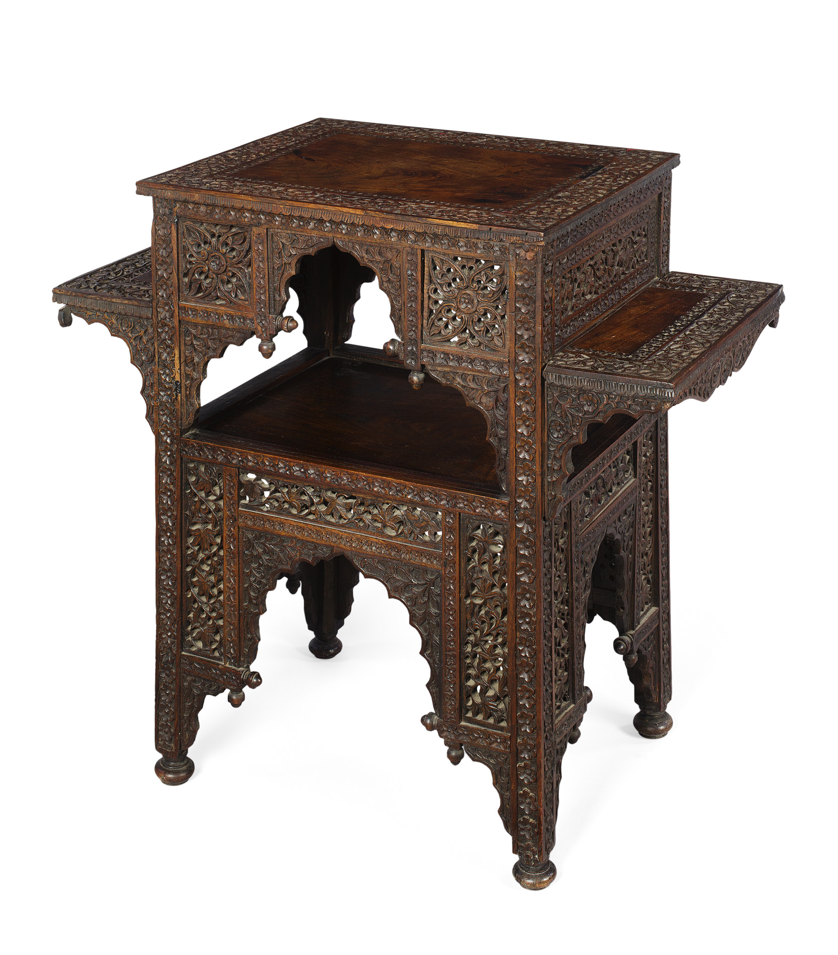 the rectangular top with a wide foliate carved border above an arched recess with pierced side panels and a pair of lateral tiers, above an arched apron and further carved and pierced panels, raised on bun feet
