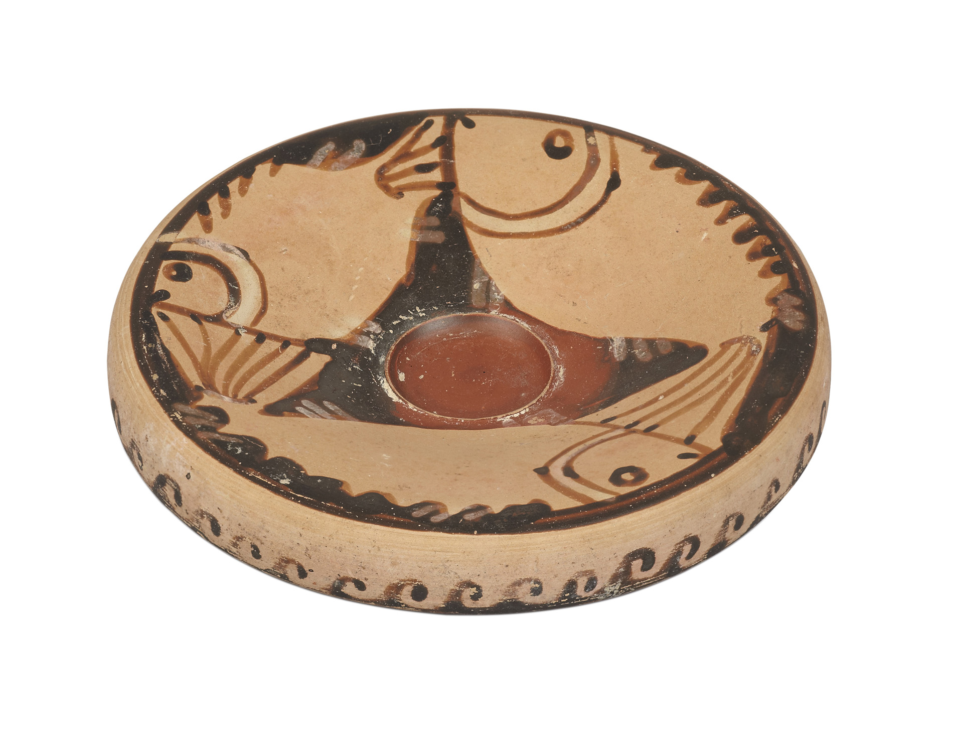 of typical shallow circular form with a turned down rim and raised on a pedestal foot, with stylised decoration