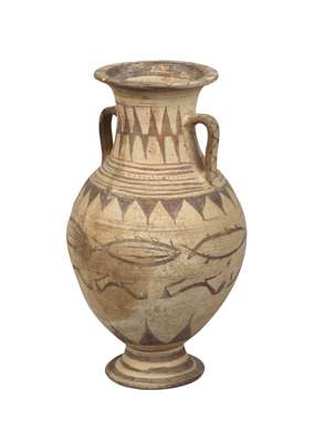 of baluster form with a flared rim and twin handles, with stylised fish motifs amongst decorative borders