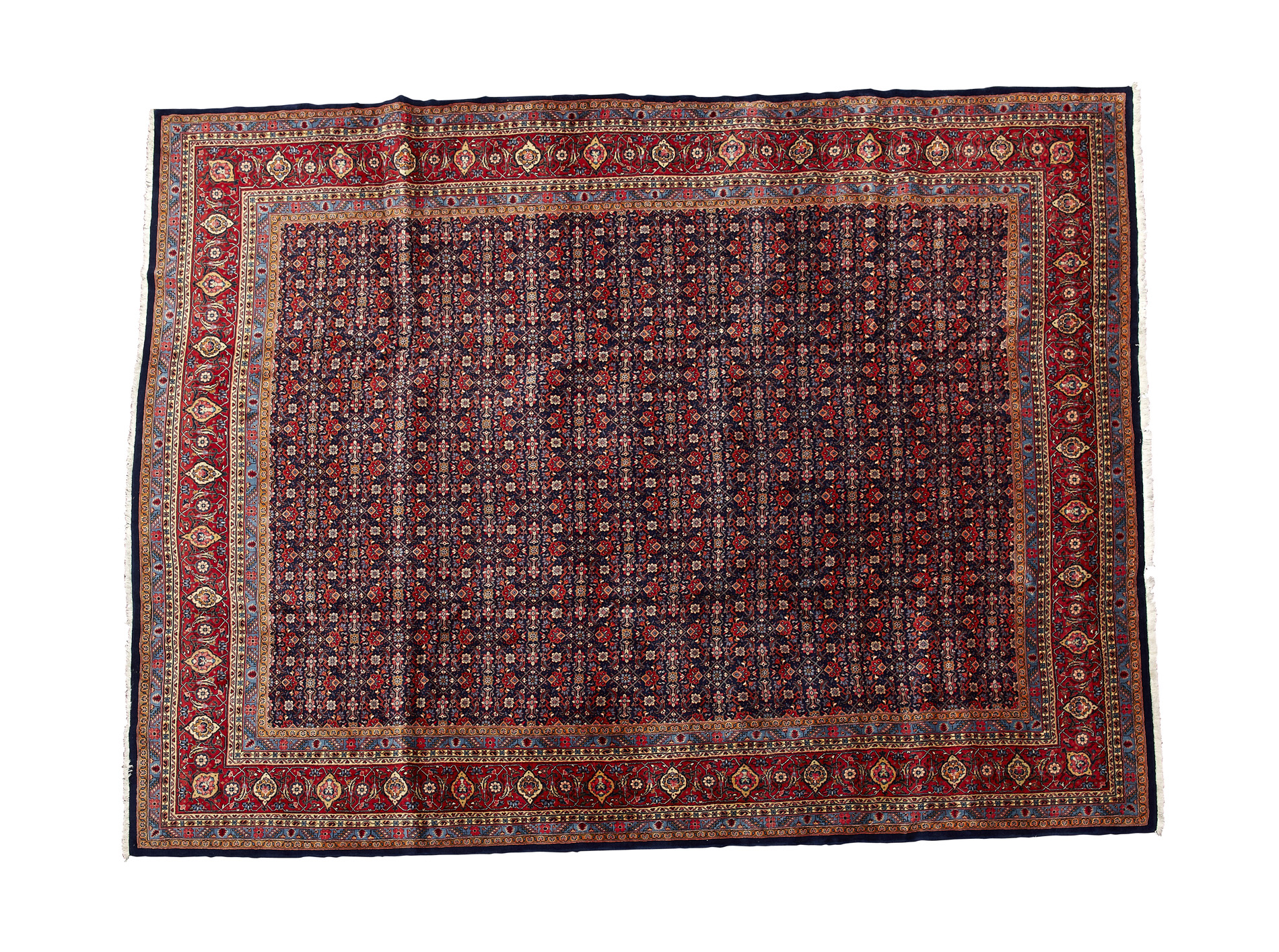 the indigo field with allover herati pattern, within red turtle palmette border