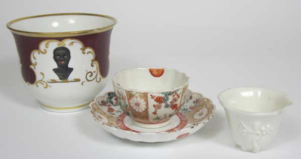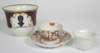 decorated with the cormorant pattern, potter's marks and incised line to underside, 12.5cm diam; together with a LARGE FLIGHT, BARR AND BARR PORCELAIN TEA CUP, painted with a crest within a puce and gilt border, mark's marks, 9cm high; an ENGLISH KAKIEMON STYLE TEA BOWL AND SAUCER, the saucer with a paper label, 7cm and 11.5cm diam; and a SMALL BLANC DE CHINE CUP, 4.5cm high (5)