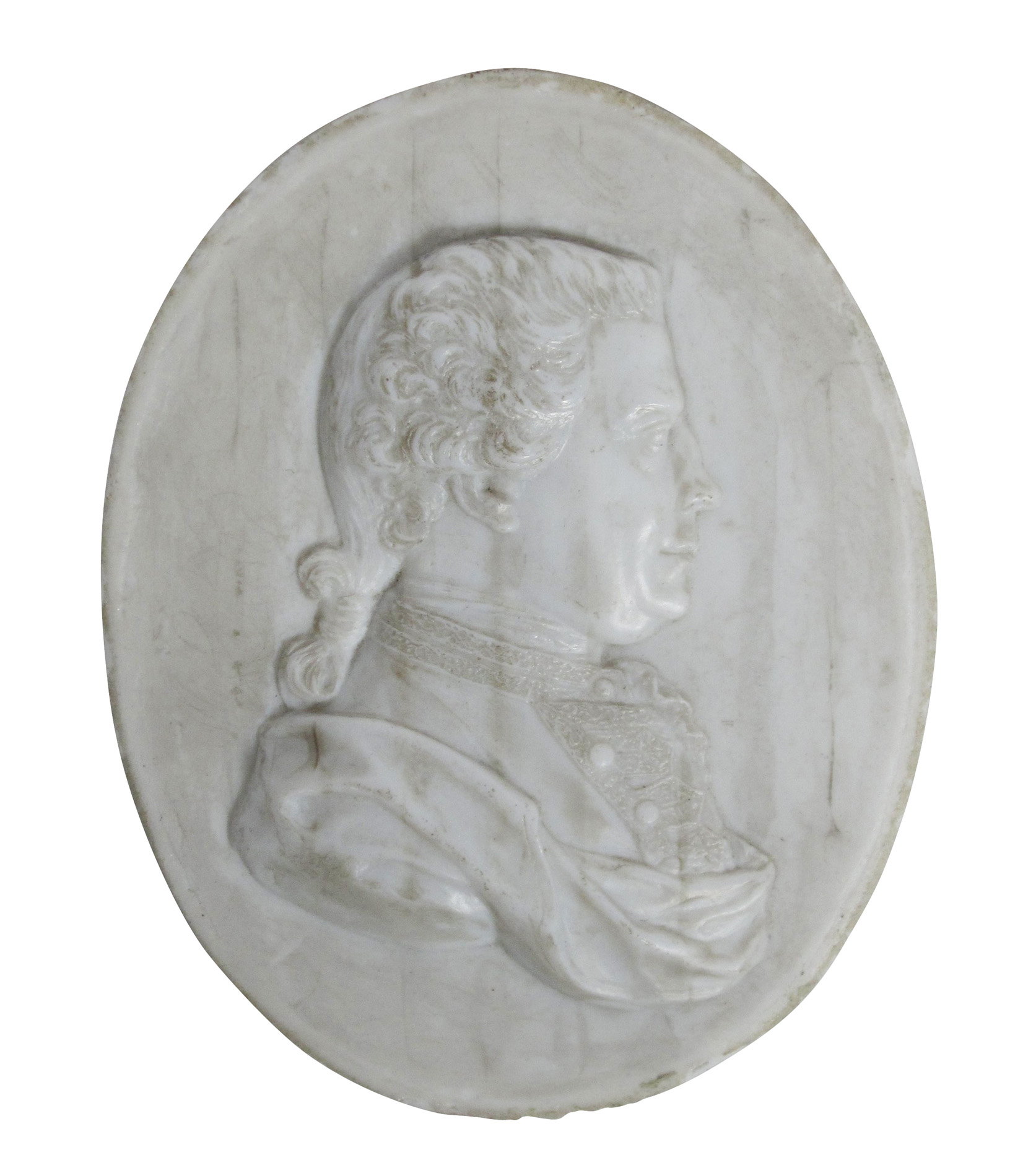 of oval form, typically modelled in profile, inscribed with a 'T', mounted in a glazed mahogany frame