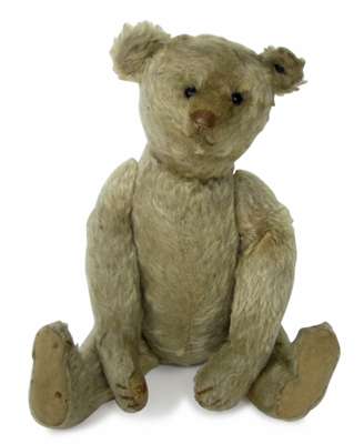 with a jointed body, black boot button eyes, a brown embroidered nose, and a button marked 'Steiff' to the ear, 32cm long approx; together with a NORAH WELLINGS DOLL, with a velvet outfit and felt shoes, with a fabric label to one foot, 23cm long approx. (2)