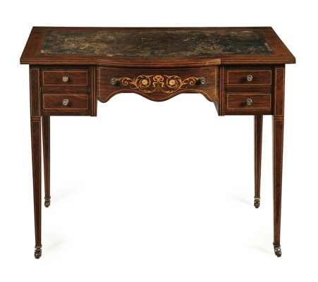 the shaped top with inset writing surface above a foliate and ribbon inlaid frieze drawer, flanked by two further drawers, raised on tapering legs and spade feet