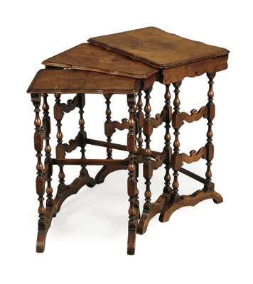 the cross banded shaped top above block and turned supports, united by stretchers, raised on trestle legs (3)