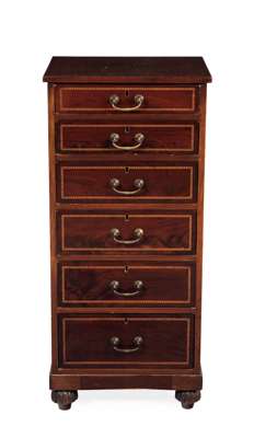 the inlaid rectangular top above six graduated drawers, raised on reeded bun feet