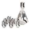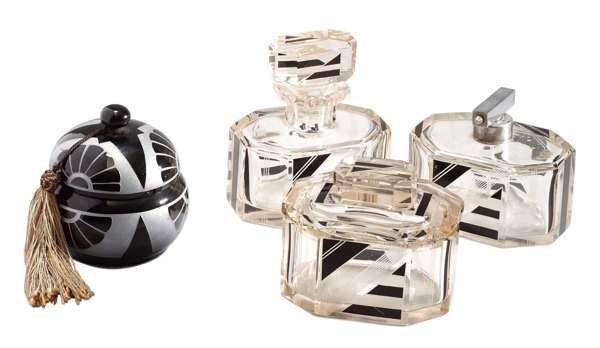 comprising of: a decanter and stopper of tapering faceted form with black and frosted geometric panels, 22cm high; with six corresponding glasses, each 6.3cm high; together with a GLASS DRESSING TABLE SET, CIRCA 1930 comprising of a: perfume bottle and stopper, 14cm high; a powder dish and cover, 11cm high; a perfume atomiser, with chromium mounts,10m high, each with black enamelled and frosted glass geometric decoration; and a FRENCH GLASS POWDER DISH AND COVER, 12cm (11)