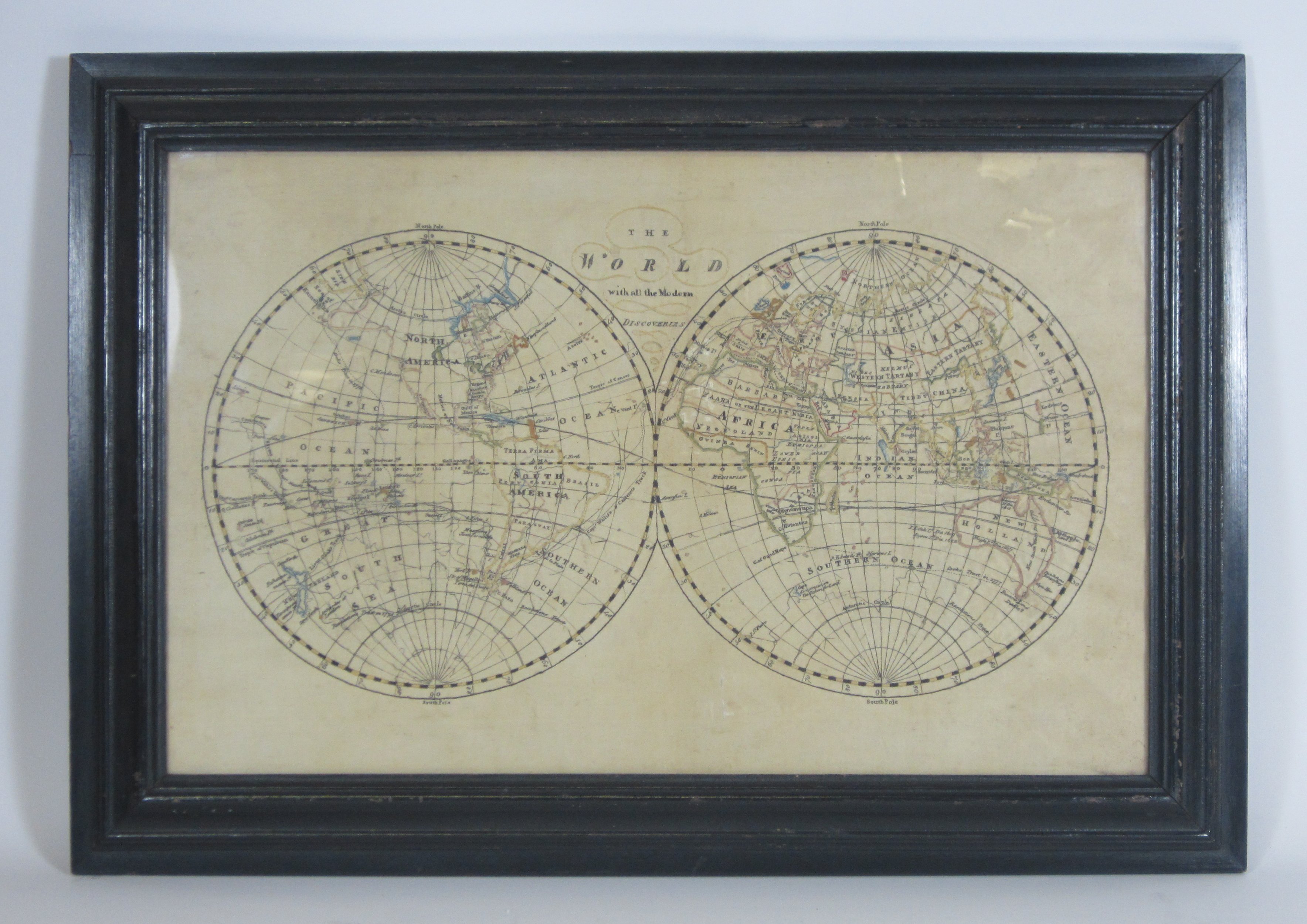 of rectangular form, the embroidered continents and countries below the inscription 'The World with all the Modern Discoveries'