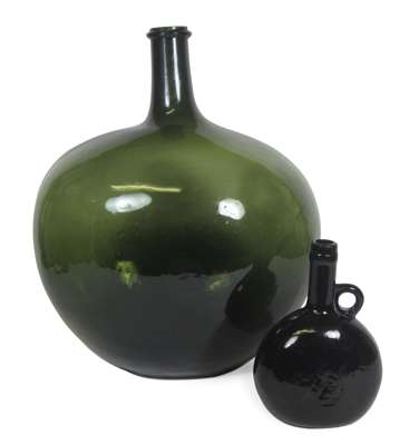 of flattened kidney form, with a cylindrical neck, 43cm high; together with a small BROWN GLASS CARBOY/ BOTTLE, of similar form, with a ring shaped handle to the neck, 20cm high (2)