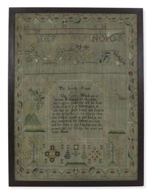 of rectangular form, with an alphabet inscription above 'The Lord's Prayer', with trees motifs surrounded by a floral border, in a glazed frame
