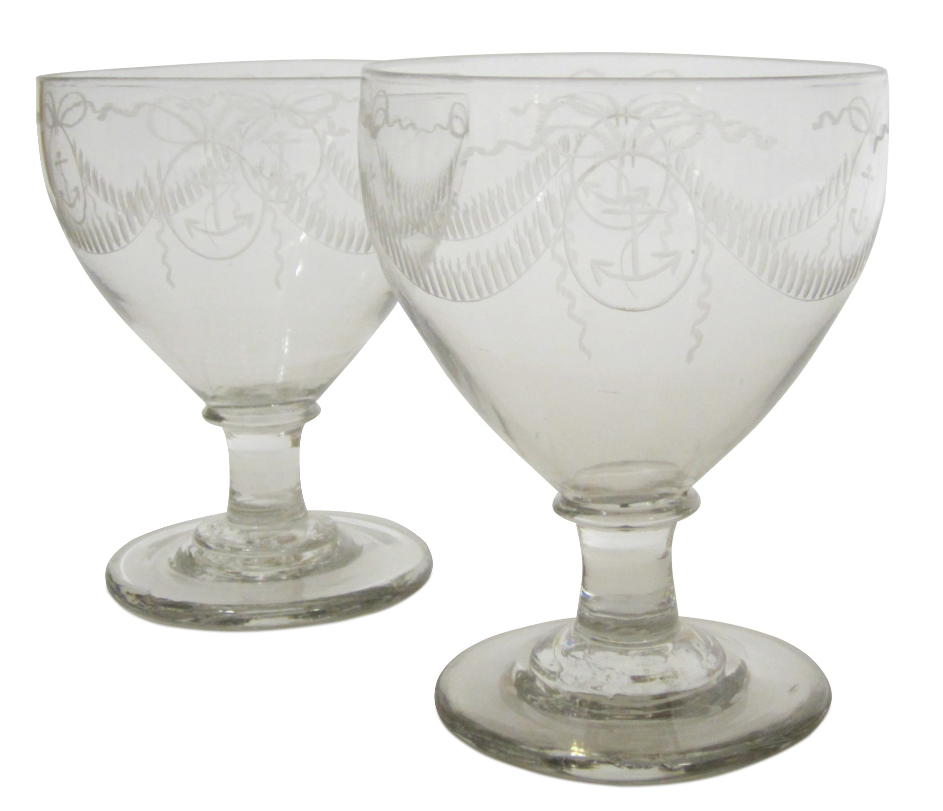 comprising of: a pair of naval glasses, decorated with fouled anchors; a pair depicting ivy and wheath sheaths; a pair etched with fruiting vines; and four further glasses, of various shape and size, decorated with foliage (10)