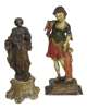 the first modelled as the Archangel Raffaelle/ Raphael with a child, with polychrome decoration, raised on a wooden base, with old paper labels, 32.5cm high overall; the second, carved as a man in robes, on a plaster base, 29cm high (2)